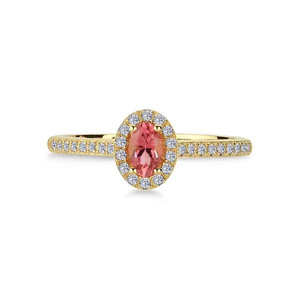 14 karats ring med en fin oval pink turmalin. I ringen sidder der 32 x 0,005 ct. brillanter i kvaliteten W/Si.