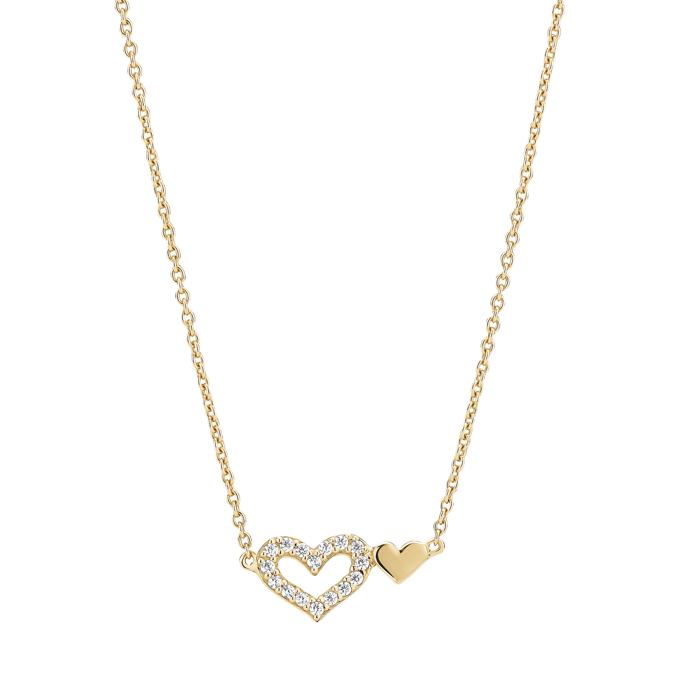 Sølv forgyldt halskæde med dobbelt hjerte fra Lund Copenhagen. I det ene hjerte er det en masse funklende zirkonia.